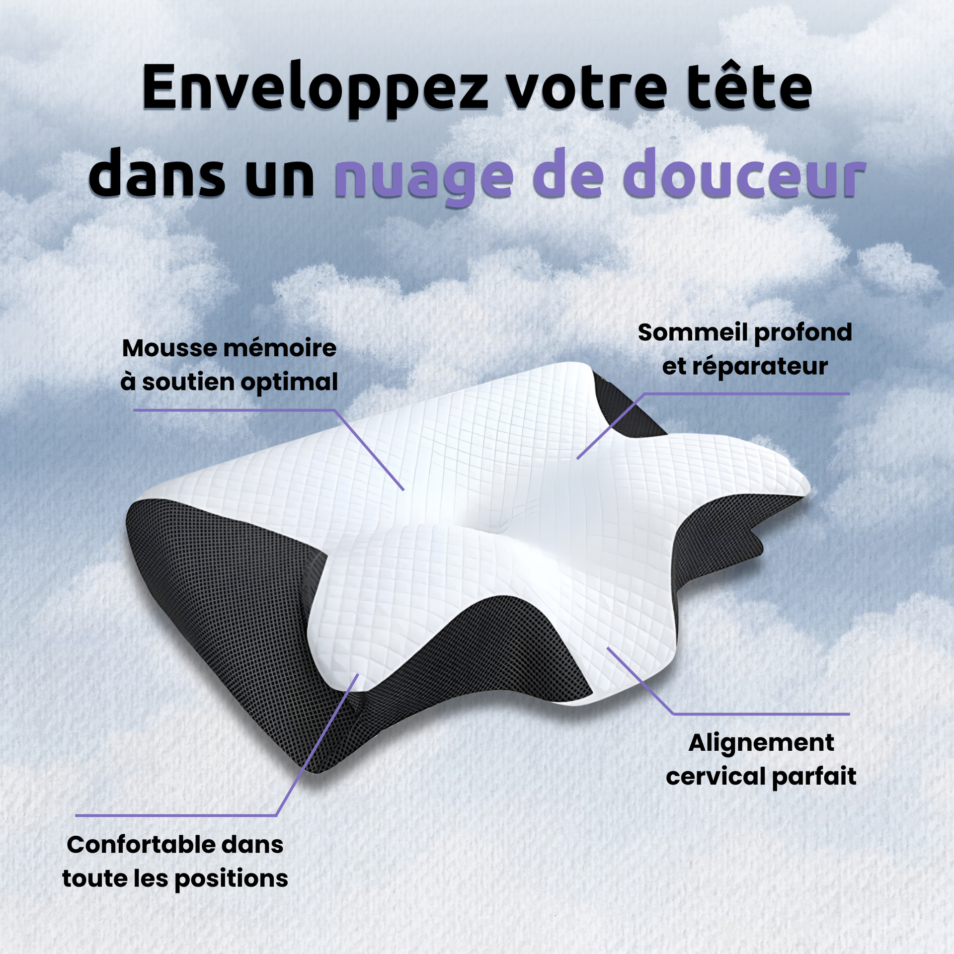 Grâce à son design papillon unique, il garde votre cou parfaitement aligné toute la nuit, vous procurant un soulagement profond et durable que les autres oreillers ne peuvent tout simplement pas égaler.