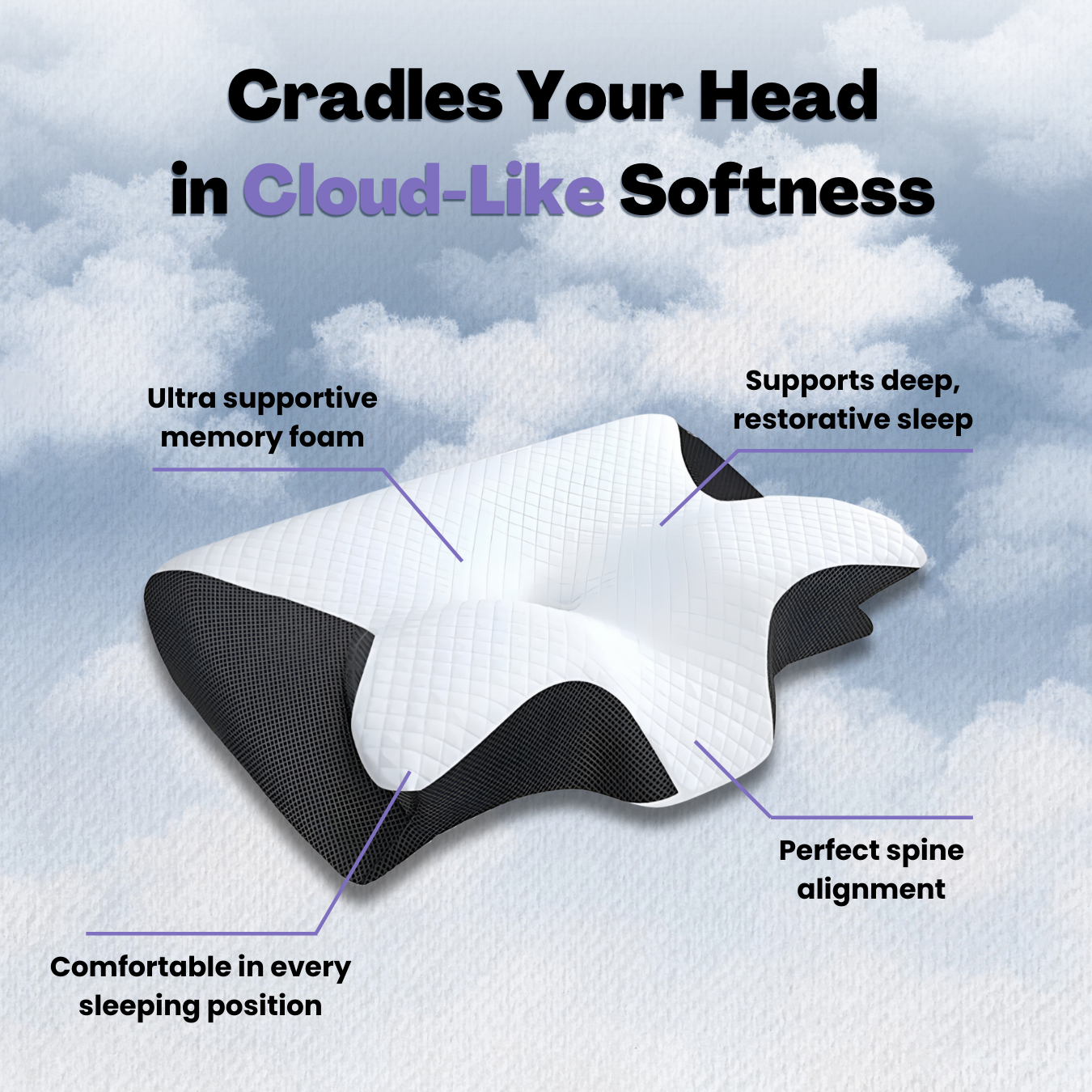 With its butterfly contour design, it cradles your head and keeps your neck perfectly aligned all night long, giving you the lasting relief other pillows simply can’t.